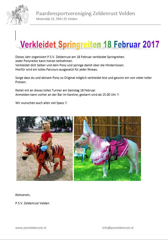 Aanvang ponys om ± 16.00 uur Vanaf 50-60 cm, vervolgd door 70 cm, 80 cm, 90 cm en 100 cm. Het inschrijfgeld voor de pony’s is € 6,-
