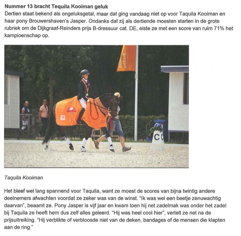 Taquila Kooiman met Brouwershavens Jasper Nederlands kampioen WAUW! Wat een topprestatie! TAQUILA KOOIMAN NEDERLANDS KAMPIOEN!!! Met haar pony Brouwershavens Jasper wist ze alle concurrentie achter zich te laten in de klasse DB dressuur. Taquila, van harte proficiat met dit fantastische resultaat!